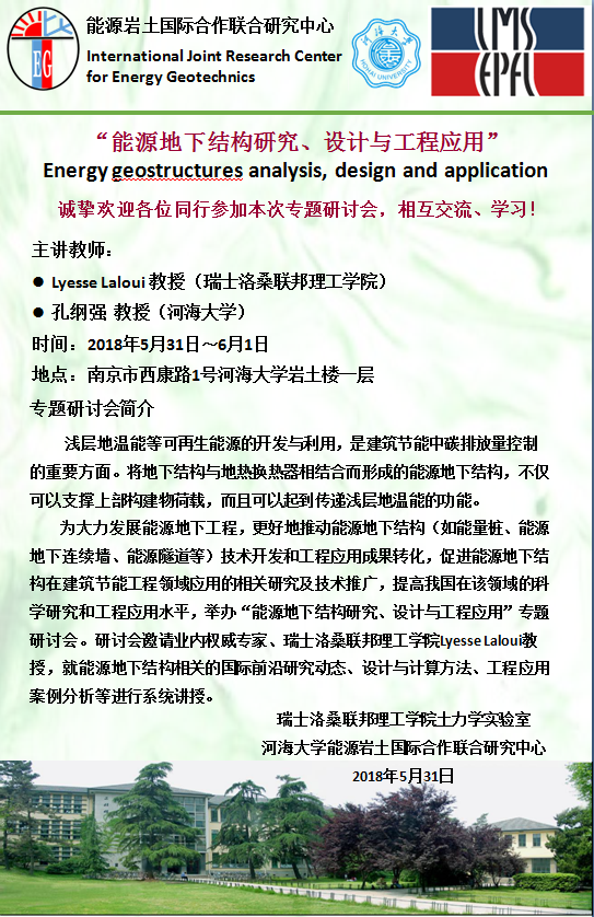 2018年5月31日~6月1日,“Energy Geostructures: Analysis, Design and Application”学术研讨会在www.allsports365.com顺利召开。本次学术研讨会由瑞士洛桑联邦理工学院土力学实验室和www.allsports365.com联合主办,由能源岩土国际合作联合研究中心组织承办;来自全国的20多家高校或科研单位的30多位代表参加了本次学术研讨会,来自美国亚利桑那州立大学陶军亮副教授等部分国外学者也参加了本次学术研讨会。