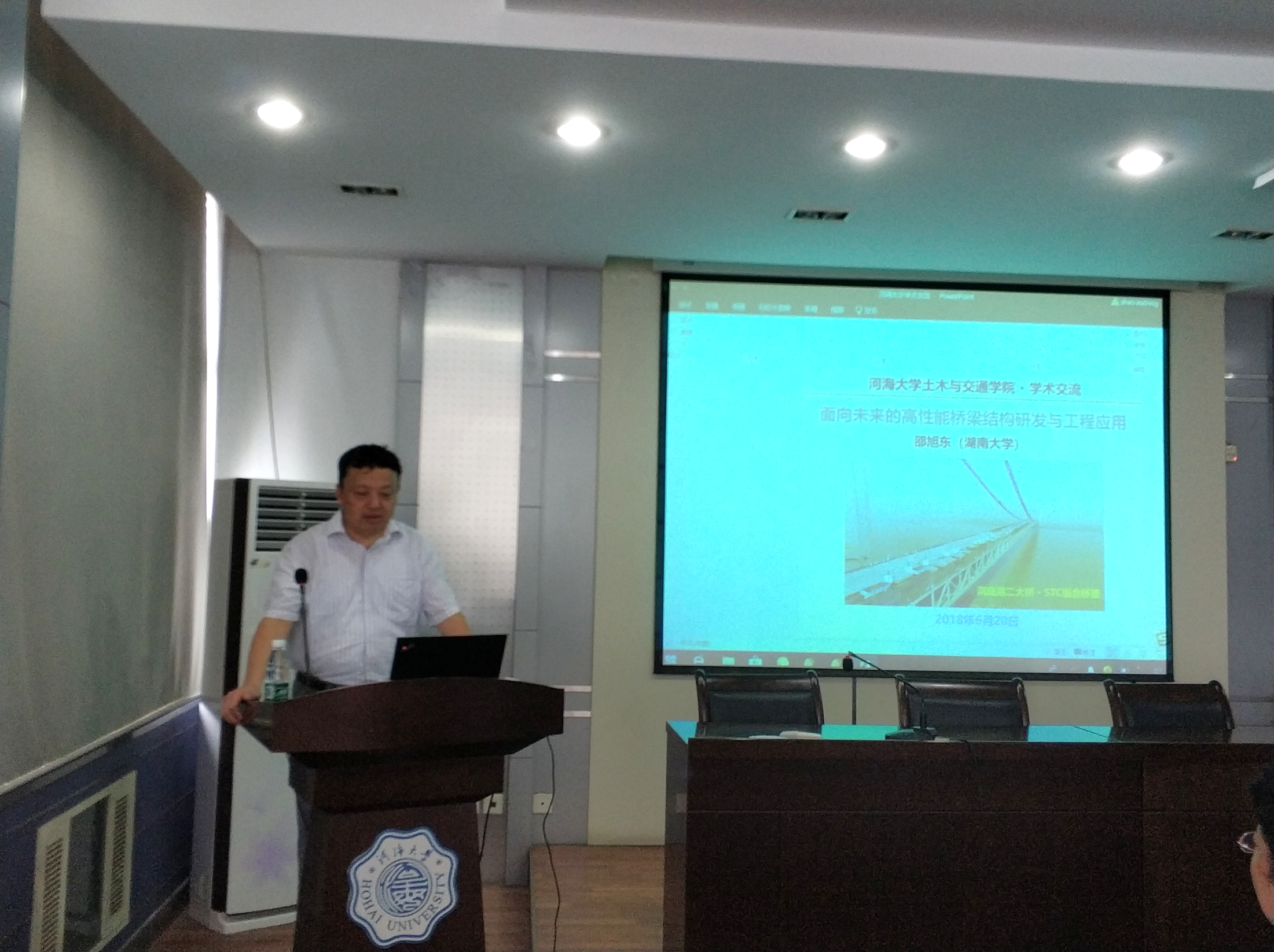 2018年6月20日,应桥梁所吉伯海教授邀请,湖南大学邵旭东教授来我院进行学术交流。邵教授在科学馆516会议室作了题为“面向未来的高性能桥梁结构研发与工程应用”的学术报告。报告会由周继凯副院长主持,桥梁工程研究所教师、土木院研究生与本科生参加了报告会。邵教授在报告中主要介绍了其团队关于超高性能混凝土(UHPC)在桥梁结构应用的研究成果,并介绍了四类高性能桥梁结构及相关工程应用。与会师生与邵教授展开了深入的讨论。